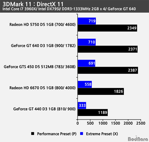 DirectX 11 ȯ°æÀ» Å×½ºÆ®ÇÏ´Â 3DMark 11¿¡¼´Â ÁöÆ÷½º GT 640ÀÇ ¼º´ÉÀÌ ¿¼¼¸¦ º¸¿´´ø ÁöÆ÷½º GTS 450À̳ª ¶óµ¥¿Â HD 57570¿¡ º¸´Ù ±ÙÁ¢ÇÑ ¼º´ÉÀ» ³»Áà DX11°ú Å×¼¿·¹ÀÌ¼Ç È¯°æÀÇ ¼º´ÉÀÌ ¿ì¼öÇÒ °ÍÀ¸·Î ¿¹»óµÈ´Ù.