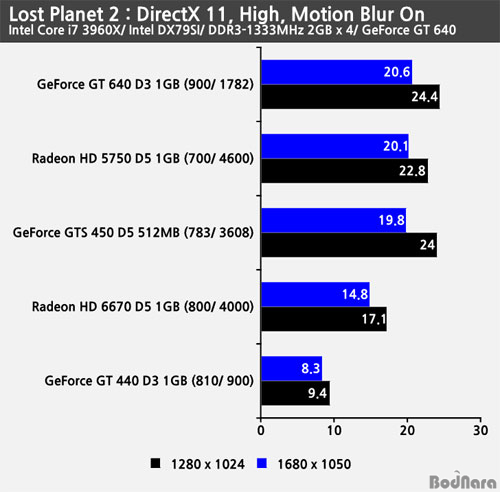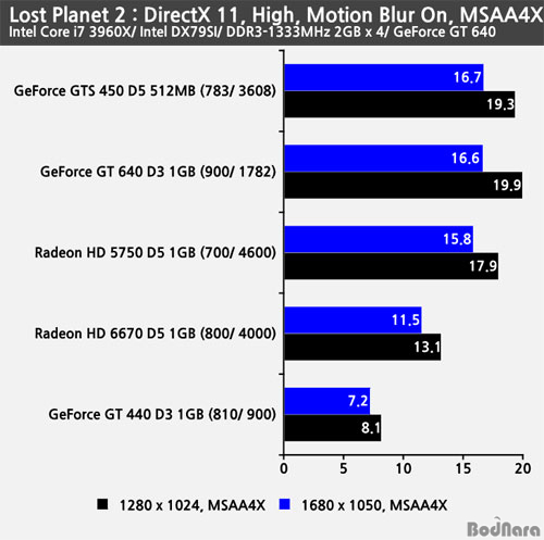 ·Î½ºÆ® Ç÷¡´Ö 2 (Lost Planet 2)´Â BŸÀÔ Å×½ºÆ®¸¦ ÀÌ¿ëÇØ DirectX 11 ȯ°æÀ» Å×½ºÆ®ÇßÀ¸¸ç, ÁöÆ÷½º GT 640Àº AA ¹ÌÀû¿ë½Ã ÁöÆ÷½º GTS 450À» ³Ñ¾î¼ °¡Àå ³ôÀº ÇÁ·¹ÀÓÀ» Á¦°øÇß´Ù. MSAA4X Àû¿ë½Ã ¶óµ¥¿Â HD 5750º¸´Ù ³ô°í ÁöÆ÷½º GTS 450¿¡´Â ¾à°£ ³·Àº ÇÁ·¹ÀÓÀ» Á¦°øÇß´Ù.