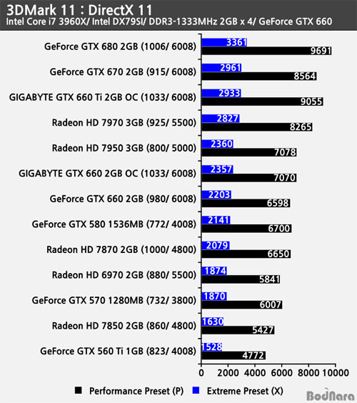 DirectX 11 ȯ°æÀ» Å×½ºÆ®ÇÏ´Â 3DMark 11¿¡¼ ÁöÆ÷½º GTX 660°ú ±â°¡¹ÙÀÌÆ® ÁöÆ÷½º GTX 660 OC´Â ÁöÆ÷½º GTX 580°ú ¶óµ¥¿Â HD 7870À» ¸ðµÎ ¾Õ¼¹À¸¸ç, ÀúÇØ»óµµº¸´Ù °íÇØ¼ºµµ¿¡¼ Á¶±Ý ´õ ¿ì¼öÇÑ ¼º´ÉÀ» Á¦°øÇß´Ù.