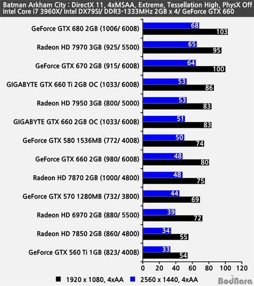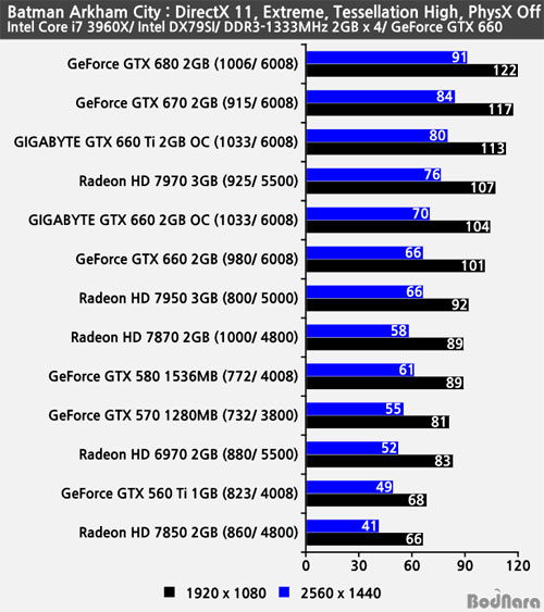 ¹èÆ®¸Ç ¾ÆÄ¯½ÃƼ (Batman : Arkham City)´Â DirectX 11À» Áö¿øÇϰí GPU °¡¼ÓµÇ´Â PhysX, Å×¼¿·¹ÀÌ¼Ç (Tessellation)À» Áö¿øÇÑ´Ù. AA ¹ÌÀû¿ë½Ã ÀúÇØ»óµµ (1920 x 1200)¿Í °íÇØ»óµµ (2560 x 1440) ¸ðµÎ ÁöÆ÷½º GTX 660°ú ±â°¡¹ÙÀÌÆ® ÁöÆ÷½º GTX 660 OC´Â ¸ðµÎ ¶óµ¥¿Â HD 7870°ú ÁöÆ÷½º GTX 580À» ¾Õ¼¹´Ù.