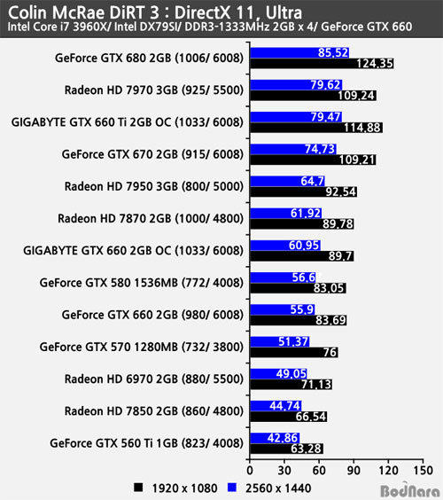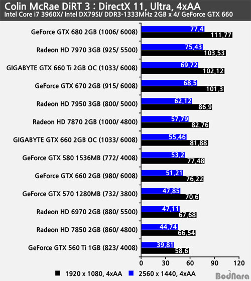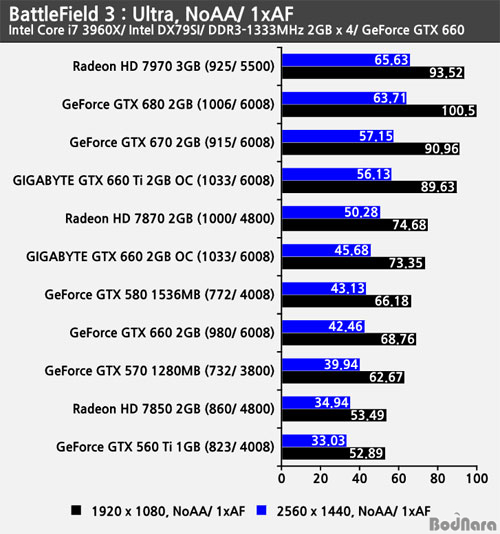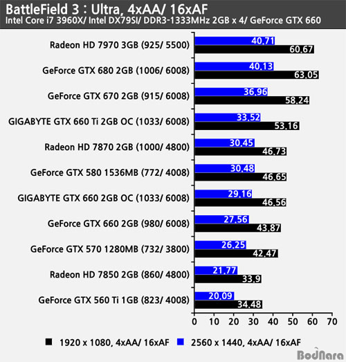 ¹èƲÇʵå 3 °ÔÀÓÀº ºÎÇϰ¡ ´Ã¾î³ª´Â 4xAA/ 16xAF¿¡¼ ·¹ÆÛ·±½º ÁöÆ÷½º GTX 660°ú ±â°¡¹ÙÀÌÆ® ÁöÆ÷½º GTX 660 OC´Â ÁöÆ÷½º GTX 580°ú ¶óµ¥¿Â HD 7870¿¡ ¾à°£ ºÎÁ·ÇÑ ¼º´ÉÀ» Á¦°øÇßÀ¸¸ç, AA/ AF ¹ÌÀû¿ë½Ã¿¡´Â ·¹ÆÛ·±½º ÁöÆ÷½º GTX 660Àº ÁöÆ÷½º GTX 570°ú ÁöÆ÷½º GTX 580 »çÀÌ, ±â°¡¹ÙÀÌÆ® ÁöÆ÷½º GTX 660 OC´Â ¶óµ¥¿Â HD 7870°ú ÁöÆ÷½º GTX 580 »çÀÌ¿¡ ¹èÄ¡µÈ´Ù.