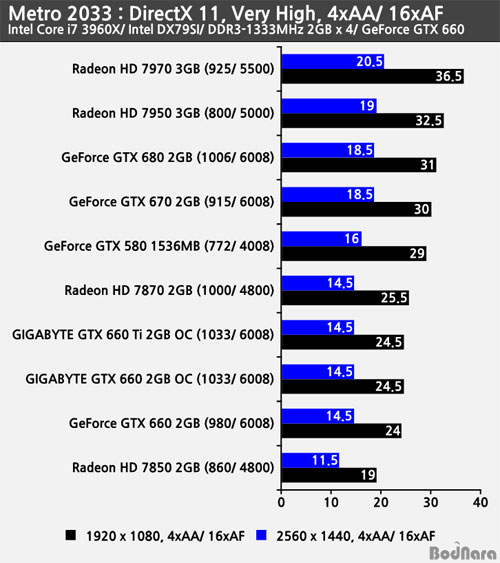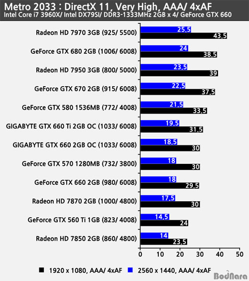 ÁöÆ÷½º GTX 660Àº GPU ºÎÇϰ¡ ´Ã¾î³ª¸é ¼º´É ÀúÇϰ¡ Å©°Ô ³ªÅ¸³ª´Âµ¥ ¸ÞÆ®·Î 2033¿¡¼´Â AAA/ 4xAF Àû¿ë½Ã ·¹ÆÛ·±½º ÁöÆ÷½º GTX 660Àº ÁöÆ÷½º GTX 570°ú ¶óµ¥¿Â HD 7870 »çÀÌ, ±â°¡¹ÙÀÌÆ® ÁöÆ÷½º GTX 660 OC´Â ÁöÆ÷½º GTX 580°ú ÁöÆ÷½º GTX 570 »çÀÌ¿¡ ¹èÄ¡µÈ´Ù. 4xAA/ 16xAF Àû¿ë½Ã ÁöÆ÷½º GTX 660°ú ÁöÆ÷½º GTX 660 Ti PC ¹öÀü ¸ðµÎ 2560x1440 ÇØ»óµµ¿¡¼´Â ¶óµ¥¿Â HD 7870°ú Å« Â÷ÀÌ ¾ø´Â ÇÁ·¹ÀÓÀ» ³»ÁáÀ¸¸ç, 1920x1080¿¡¼´Â ¶óµ¥¿Â HD 7870¿¡´Â 2fsp ³»¿ÜÀÇ Â÷À̸¦ Á¦°øÇØ ºñ½ÁÇÑ ¶óÀξ÷¿¡¼ÀÇ ¼º´É Â÷ÀÌ´Â °ÅÀÇ ¾ø´Ù.
