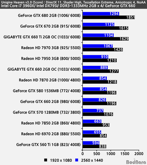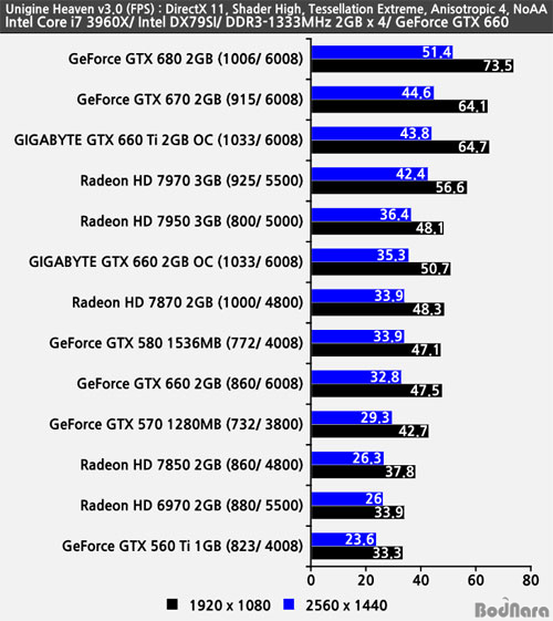 ¿£ºñµð¾Æ´Â AMD¿Í ºñ±³ÇØ DX11°ú Å×¼¿·¹ÀÌ¼Ç Ã³¸® ¼º´ÉÀÌ ¿ì¼öÇϸç, Æä¸£¹Ì (Fermi)¸¦ À̾î¹ÞÀº ÄÉÇ÷¯ (Kepler) ¾ÆÅ°ÅØÃ³ ±â¹Ý ÁöÆ÷½º GTX 660 ·¹ÆÛ·±½º´Â ÁöÆ÷½º GTX 580°ú ¶óµ¥¿Â HD 7870¿¡ ¾à°£ ºÎÁ·ÇÑ ¼º´É, ±â°¡¹ÙÀÌÆ® ÁöÆ÷½º GTX 660 OC´Â ¶óµ¥¿Â HD 7870°ú ÁöÆ÷½º GTX 580 ÀÌ»óÀÇ Ã³¸® ¼º´ÉÀ» Á¦°øÇÑ´Ù.