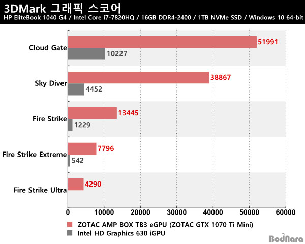 ±×·¡ÇÈ Ä«µåÀÇ 3D ¼º´ÉÀ» ÃøÁ¤ÇÏ´Â 3DMark ±×·¡ÇÈ Á¡¼ö¸¦ ºñ±³Çغ¸¸é ÀÎÅÚ ³»Àå ±×·¡ÇȰú ÁöÆ÷½º GTX 1070 Ti°¡ µé¾î°£ Á¶ÅØ