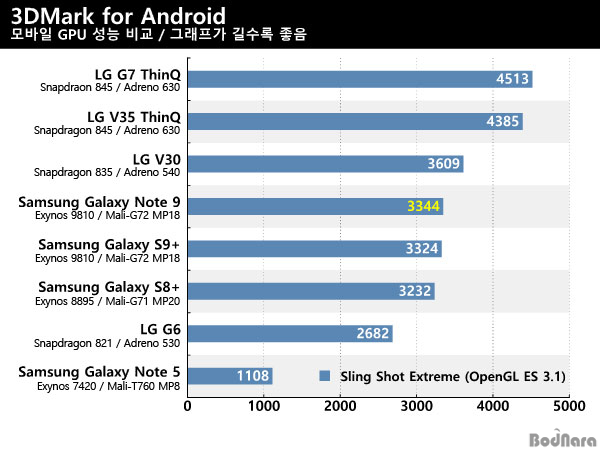 LGÀüÀÚ ½º¸¶Æ®Æù¿¡ žÀçµÈ ½º³Àµå·¡°ï °è¿°ú GPU ¼º´ÉÀ» ºñ±³Çغ¸¸é ¿¢½Ã³ë½º 9810¿¡ µé¾î°£ Mali-G72 MP18Àº 3DMark