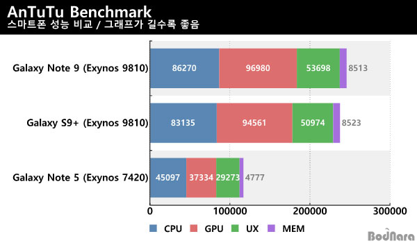 AnTuTu º¥Ä¡¸¶Å© ±âÁØÀ¸·Î CPU¿Í ¸Þ¸ð¸®, UX Á¡¼ö´Â 1.6~1.9¹è, GPU Á¡¼ö´Â 2.5¹è ÀÌ»ó Â÷À̰¡ ³´Ù.