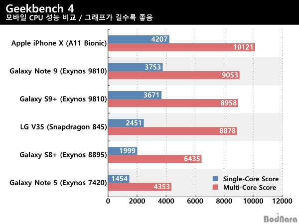 Geekbench 4¸¦ ÅëÇØ CPU ¼º´ÉÀ» »ìÆìº¸¸é °¶·°½Ã ³ëÆ®9¿¡ µé¾î°£ ¿¢½Ã³ë½º 9810Àº ½Ì±ÛÄÚ¾î¿Í ¸ÖƼÄÚ¾î Á¡¼ö ¸ðµÎ ¾Èµå·ÎÀ̵å