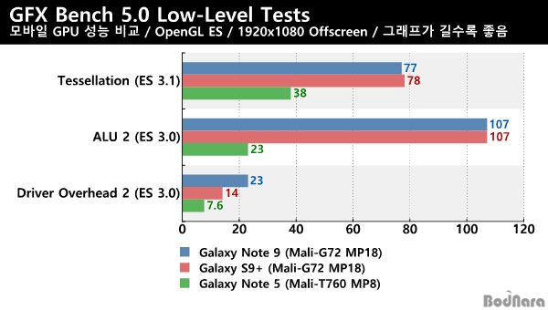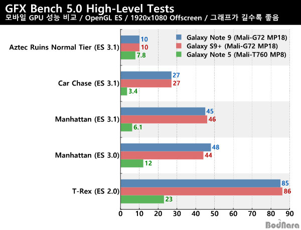 º¸´Ù ´Ù¾çÇÑ ±×·¡ÇÈ Á¡¼ö¸¦ »ìÆìº¸±â À§ÇØ GFXBench 5.0 Å×½ºÆ®¸¦ ½Ç½ÃÇÑ °á°ú °¶·°½Ã ³ëÆ®9°ú S9+ÀÇ ¼º´É Â÷ÀÌ´Â °ÅÀÇ ¾ø¾úÀ¸¸ç,