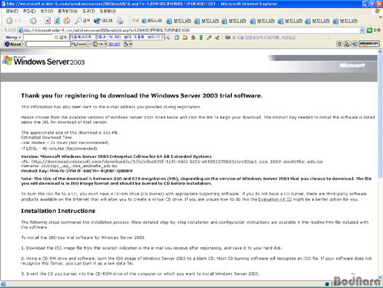 Á¤º¸¿¡ ÀÔ·ÂÇÑ À̸ÞÀÏ ÁÖ¼Ò·Î À̹ÌÁö Çü½ÄÀ¸·Î ¸¸µé¾îÁø ISO·Î ¸¸µé¾îÁø ÆÄÀÏÀ» ´Ù¿î¹ÞÀ» ¼ö ÀÖ´Â ¸µÅ©¿Í ½Ã¸®¾ó ¹øÈ£°¡ ¹ß¼ÛµÈ´Ù. µû¶ó¼­ À̸ÞÀÏ ÁÖ¼Ò´Â Á¤È®ÇÏ°Ô ÀÔ·ÂÇØ¾ß ÇÔÀÌ Çʼö. ´Ù¿î¹ÞÀº ISO À̹ÌÁö ÆÄÀÏÀ» CD¿¡ ±¸¿ì¸é Windows Server 2003 Æò°¡ÆÇ CD°¡ ¿Ï¼ºµÈ´Ù.