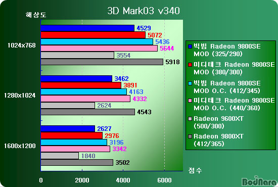 ¡ã 3D Mark03 °á°úµµ ¸¶Âù°¡Áö·Î °³Á¶ Àü Radeon 9600XT¿¡ µÚÃÄÁö´ø ºòºö Radeon 9800SEµµ ÆÄÀÌÇÁ¶óÀÎ °³Á¶ ÈÄ 325/290ÀÇ ³·Àº ±âº» Ŭ·°¿¡¼­µµ Radeon 9600XT¿¡ Å©°Ô ¾Õ¼­°í ÀÖ´Ù.
