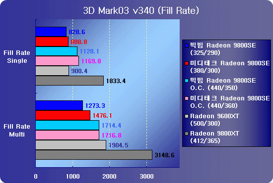 ¡ã 3D Mark03ÀÇ Fill Rate Å×½ºÆ® °á°ú´Â Multi¿¡¼­ 2¹èÀÇ ¼º´É Â÷À̸¦ º¸¿©ÁÖ°í ÀÖ´Ù. °³Á¶ ÈÄ Radeon 9800XTÀÇ Å¬·°¿¡ °ÅÀÇ ±ÙÁ¢ÇÏ°Ô ¿À¹öŬ·°ÇÑ ¹ÌµðÅ×Å© CRASH Radeon 9800SE´Â Radeon 9800XT¿Í °°Àº ¼º´ÉÀ» º¸¿©ÁØ´Ù.