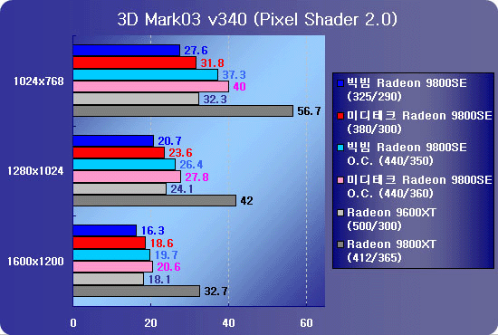 ¡ã °³Á¶ ÈÄÀÇ Å×½ºÆ® °á°ú¸¦ º¸¸é Radeon 9600XT¸¦ Á¦¿ÜÇÑ °³Á¶/¿À¹ö Radeon 9800SE¿Í Radeon 9800XT¿ÍÀÇ ½Î¿òÀÌ´Ù. ¸Þ¸ð¸® Ŭ·° Â÷ÀÌ·Î ÀÎÇØ Radeon 9800XT¿Í ¿ÏÀüÈ÷ ¶È°°Àº ¼º´ÉÀ» ³»Áø ¸øÇßÁö¸¸ Radeon 9800/9800 ProÁ¤µµÀÇ ¼º´ÉÀº ÃæºÐÈ÷ º¸ÀåÇÑ´Ù. (´Ü, °³Á¶¿¡ ¼º°øÇßÀ» ¶§ÀÇ ¾ê±âÁö¸¸...)
