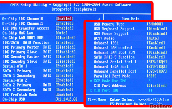 Integrated Peripherals Ç׸ñ¿¡¼´Â ¸ÞÀκ¸µåÀÇ °¢Á¾ ºÎ°¡ ±â´É°ú IDE / SATA ¼³Á¤ ¹× RAID ¼³Á¤À» Á¶ÀýÇÒ ¼ö ÀÖ´Ù. nForce4 SLIÀÇ NVRAID¿Ü¿¡ Sil3114 SATA RAID ÄÁÆ®·Ñ·¯µµ ´Þ·ÁÀÖ¾î SATA RAID ¼³Á¤ÀÌ 2°³·Î ³ª´²Á® ÀÖ´Ù.