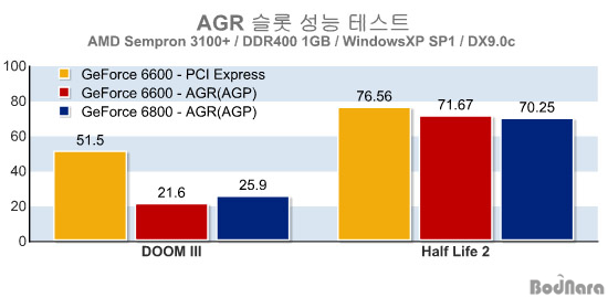 À̹ø¿¡´Â AGR ½½·Ô¿¡ GeForce 6600 ´ë½Å¿¡ ¼º´ÉÀÌ ÈξÀ ³ôÀº GeForce 6800 AGP ±×·¡ÇÈ Ä«µå¸¦ ÀåÂøÇÏ¿´À¸³ª, PCI Express ½½·ÔÀ» »ç¿ëÇÏ´Â GeForce 6600º¸´Ùµµ ¶³¾îÁö´Â ¼º´ÉÀ» º¸¿´´Ù. DOOM III¿¡¼´Â ¾à°£ ¼º´ÉÀÌ ¿Ã¶ó°£ ÆíÀÌÁö¸¸ Half Life 2¿¡¼ÀÇ Æò±Õ ÇÁ·¹ÀÓÀº ¶³¾îÁ³´Ù. ½ÇÁ¦ GeForce 6800°ú 6600ÀÇ ¼º´É Â÷À̸¦ °í·ÁÇØº¸¸é, AGR ½½·ÔÀÇ ÇѰè·Î ¾Æ¹«¸® ¼º´ÉÀÌ ÁÁÀº AGP ±×·¡ÇÈ Ä«µå¸¦ »ç¿ëÇÏ´õ¶óµµ ¼Ò¿ëÀÌ ¾ø´Ù´Â °ÍÀ» ¾Ë ¼ö ÀÖ´Ù.