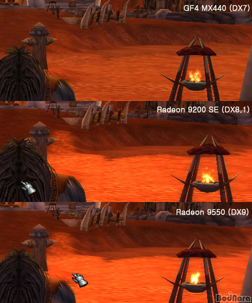 DirectX ¼¼´ëº°·Î ÄÓ ¼ö ÀÖ´Â ¿É¼ÇÀ» ´Ù ÄÒ »óÅ¿¡¼­ È­ÁúÀ» ºñ±³ÇÑ °ÍÀε¥, DirectX 8.1 ¼¼´ë¿Í 9.0 ¼¼´ë´Â Â÷À̰¡ ³ªÁö ¾Ê´Â´Ù. WOW°¡ DX8.1 ±â¹ÝÀÇ °ÔÀÓÀ̶ó´Â ÀǹÌÀÌ´Ù. ¹Ý¸é DirectX 7±îÁö¸¸ Áö¿øÇÏ´Â MX440Àº ÁÖº¯ »ç¹°À» ¸ðµÎ Ç¥ÇöÇÏ°Ô ¸¸µé¼ö´Â ÀÖÁö¸¸ ±¤¿øÈ¿°ú´Â Á¦´ë·Î Ç¥ÇöÇÏÁö ¸øÇϰí ÀÖ´Ù. ¾ÆÁ÷Àº ´ëºÎºÐÀÇ ¿Â¶óÀÎ °ÔÀÓÀÌ DirectX 8.1À» ¹þ¾î³ªÁö ¸øÇϰí Àֱ⠶§¹®¿¡, ÃæºÐÇÑ ÇÁ·¹ÀÓÀ²¸¸ À¯ÁöÇØÁØ´Ù¸é ±»ÀÌ DirectX 9.0À» Áö¿øÇÏ´Â ±×·¡ÇÈÄ«µå¸¦ ±¸ÀÔÇØ¾ß¸¸ ÇÏ´Â ÀÌÀ¯´Â ¾ÆÁ÷±îÁø ¾ø´Ù.