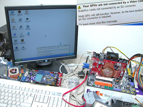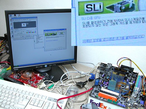 ÀÌó·³ »ó´çÇÑ »ðÁú(?) ³¡¿¡ INSIDE HAN 6600 EX°ú GeForce 6600 GT¸¦ ¿¬°áÇÏ¿© SLi ±¸¼ºÀ» ¸¸µé¾ú´Âµ¥ ÀÌ»óÇÏ°Ô µÎ °³ÀÇ ±×·¡ÇÈÄ«µå¸¦ ¿¬°áÇÏ´Â SLi ¿¬°á Ä¿³ØÅͰ¡ ¿¬°áÀ̵ÇÁö ¾Ê¾Ò´Ù´Â ¸Þ½ÃÁö°¡ Ãâ·ÂµÇ¾î ¾ÆÁ÷Àº INSIDE HAN 6600 EX ÀÚü¿¡¼­µµ SLi ¿¬°á Ä¿³ØÅ͸¦ »ç¿ëÇÏÁö ¸øÇÏ°Ô µÇ¾îÀÖ´Ù°í »ý°¢ÇÏ¿´´Ù. ±×·¯³ª Ȥ½Ã³ª ÇØ¼­ ´Ù¸¥ ȸ»çÀÇ GeForce 6600 GT¿Í MSIÀÇ GeForce 6600 GT¸¦ ¿¬°áÇØº» °á°ú À§¿Í µ¿ÀÏÇÑ ¸Þ½ÃÁö°¡ Ãâ·ÂµÇ¾ú´Ù. µû¶ó¼­ À̹ø ½ÇÇèÀÇ °á°ú·Î µûÁ®º¸¸é µ¿ÀÏ È¸»çÀÇ Á¦Ç°ÀÌ ¾Æ´Ï°í ¹ÙÀÌ¿À½ºµµ ´Ù¸¥ Á¦Ç°ÀÇ ±¸¼ºÀ̱⿡ ÀÌ·± ¸Þ½ÃÁö°¡ Ãâ·ÂµÈ´Ù°í °á·ÐÁöÀ»¼ö ÀÖ´Ù.