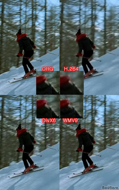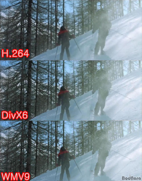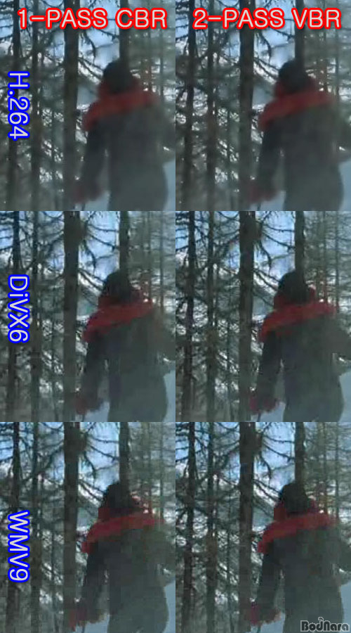 H.264·Î ÀÎÄÚµù µÈ °á°ú¹°Àº ´ëüÀûÀ¸·Î ºñÆ®·¹ÀÌÆ®¸¦ °¡¸®Áö ¾Ê°í ¹¶°³Áö´Â °ÍÀÌ Æ¯Â¡ÀÌ´Ù. (¹°·Ð »ó¿ëÈ­µÈ ÄÚµ¦°ú´Â Â÷À̰¡ ÀÖÀ» ¼ö ÀÖ´Ù) ¶§¹®¿¡ ¾Ö´Ï¸ÞÀ̼Çó·³ ¸é°ú ¸éÀÇ ¿Ü°ûÀ» Ç¥ÇöÇÏ´Â ´É·Â¿¡¼­´Â À¯¸®ÇÏÁö¸¸ dz°æ µîÀÇ ¹¦»ç¿¡¼­´Â ´Ù¼Ò ¶³¾îÁú ¼ö ÀÖ´Ù. 2-Pass ÀÎÄÚµù µÇ¾úÀ» ¶§ È­Áú Çâ»óÀÌ °¡Àå ÁÁ¾Ò´ø ÄÚµ¦Àº WMV9ÀÌÁö¸¸ ÁÁ¾ÆÁø »óÅ¿¡¼­µµ ±ïµÎ±â ³­¹«´Â ÇÇÇÒ ±æÀÌ ¾ø¾ú°í, DivX6´Â ³ª¹«ÀÇ µðÅ×ÀÏÀÌ ¾à°£ ÁÁ¾ÆÁ³´Ù.