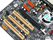 Àü¿ø Ä¿³ØÅͰ¡ À§Ä¡ÇÏ°í ¹Ù·Î ¿·À¸·Î IEEE1394 Ä¿³ØÅͰ¡ Á¦°øµÈ´Ù. »ó´Ü¿¡´Â DDR SDRAM Áö¿øÀ» À§ÇÑ ¸Þ¸ð¸® ½½·Ô 4°³°¡ À§Ä¡Çϸç, »ö»óÀ¸·Î ±¸ºÐÇÏ¿© µà¾ó ä³Î ±¸¼ºÀÌ º¸´Ù ½±µµ·Ï ¹è·ÁÇϰí ÀÖ´Ù. ¹Ù·Î ¿·À¸·Î´Â 24ÇÉ