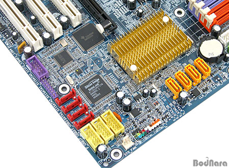 IDE Ä¿³ØÅÍ Çϳª°¡ ¼öÁ÷À¸·Î À§Ä¡Çϸç, ¹Ù·Î ¿ÞÂÊÀ¸·Î 4°³ÀÇ SATA II Áö¿ø Æ÷Æ®°¡ Á¦°øµÈ´Ù.