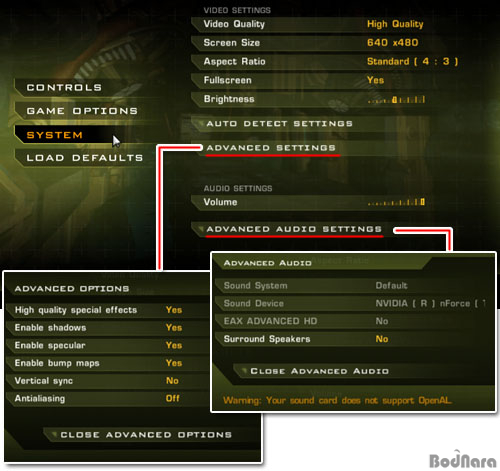 Advanced Option¿¡¼­´Â 5°³ÀÇ ±×·¡ÇÈ °ü·Ã È¿°ú¿Í Á֯ļö¸¦ °íÁ¤ÇÏ´Â Vertical sync Ç׸ñÀÌ ÀÖÀ¸¸ç, Advanced Audio ¸Þ´º´Â EAX Advanced HD ¿Àµð¿À¸¦ Áö¿øÇÏ¸ç ¼­¶ó¿îµå ½ºÇÇÄ¿ ¼³Á¤À» ÇÒ ¼ö ÀÖ´Ù.