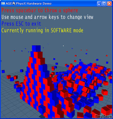 À§ÀÇ AGEIA PhysX Hardware DemoÀº Á¤»ç°¢ÇüÀÇ ¹Ú½º°¡ ½×¿©Àִ°÷¿¡ °øÀ» ´øÁ® ¹Ú½ºµéÀÌ ½ñ¾ÆÁö´Â ¸ð½ÀÀ» º¸¿©ÁÖ´Â µ¥¸ð·Î½á ¹Ú½ºµéÀÇ ¿òÁ÷ÀÓ¸ðµÎ ¹°¸® ¿£ÁøÀ¸·Î ó¸®µÇ°Ô µÇ¾î ÀÖ´Ù. PhysX ÇÁ·Î¼¼¼­°¡ ÀåÂøµÇ¾î ÀÖÁö ¾ÊÀ¸¸é CPU¸¦ ÅëÇØ ¹°¸® ¿¬»êÀ» ó¸®Çϸç PhysX ÇÁ·Î¼¼¼­°¡ ÀåÂøµÇ¾î ÀÖÀ¸¸é PhysX ÇÁ·Î¼¼¼­·Î ¹°¸® ¿¬»êÀ» ó¸®ÇÑ´Ù.