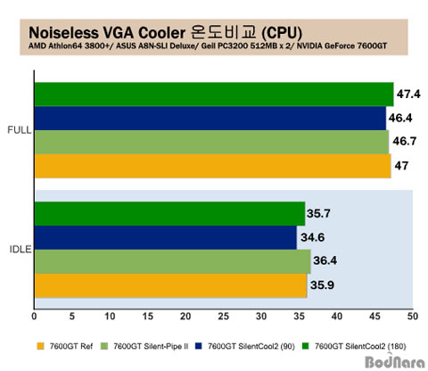 ASUS SilentCool2¿Í GIGABYTE Silent-Pipe II¸¦ ¼³Ä¡ÇÏ¿´À» ¶§ÀÇ GPU ¿Âµµ¸¦ ·¹ÆÛ·±½º VGA Äð·¯¿Í ºñ±³ÇÏ¿© º¸¾Ò´Ù. ÀÏ´Ü, ASUS SilentCool2ÀÇ °æ¿ì 90µµ ¼³Ä¡¿¡¼­´Â °¡Àå ÁÁÀº È¿À²À» º¸Àδٰí ÇÏ¿´´Âµ¥ ½ÇÁ¦·Îµµ ·¹ÆÛ·±½º Äð·¯¿Í ºñ±³ÇÏ¿© ¾à 6µµ¿¡ À̸£´Â ÁÁÀº ¿Âµµ¸¦ º¸¿©ÁÖ¾ú´Ù. 180µµ ¼³Ä¡ÀÇ °æ¿ì 20ºÐÀÌ Áö³ª¸é¼­´Â ·¹ÆÛ·±½º Äð·¯ ¼öÁØÀÇ ¿Âµµ¸¦ º¸¿´´Ù. ÀÌ °á°ú·Îµµ 90µµ ¼³Ä¡°¡ °¡Àå ÁÁÀº È¿À²À» º¸À̹ǷΠCPU ¿¡¾î °¡À̵åÀÇ °£¼·ÀÌ ¾ø´Ù¸é 90µµ ¼³Ä¡¸¦ ÇÏ¿© »ç¿ëÇÏ´Â °ÍÀÌ À¯¸®ÇÏ´Ù. GIGABYTE Silent-Pipe II´Â ASUS SilnetCool2ÀÇ 90µµ¿Í 180µµ ¼³Ä¡ »çÀÌÀÇ ¿Âµµ¸¦ º¸¿©ÁÖ¾ú´Âµ¥ ·¹ÆÛ·±½º Äð·¯¿Í 180µµ ¼³Ä¡º¸´Ù ¾à 2µµ °¡·® ³·Àº ¿Âµµ¸¦ º¸¿©ÁÖ¾ú°í 90µµ ¼³Ä¡¿Í´Â ¾à 4µµ Á¤µµÀÇ Â÷À̸¦ º¸¿© ASUS SilentCool2ÀÇ 90µµ È¿À²ÀÌ °¡Àå ³ôÀº °ÍÀ» È®ÀÎÇÒ ¼ö ÀÖ¾ú´Ù. ÀÌ´Â Èĸé 120mm ÆÒÀÇ Áõ°¡µÈ dz·®¿¡ ÀÇÇØ º¸´Ù ºü¸¥ Äð·¯ÀÇ ¿­À» ¹èÃâÀÌ °¡´ÉÇÏ°Ô µÇ±â ¶§¹®ÀÌ´Ù.