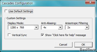 µ¥¸ð¿¡ µé¾î°¡±â¿¡ ¾Õ¼­ Cascades ConfigurationÀ» ÅëÇØ µ¥¸ðÀÇ ÇØ»óµµ³ª AA, AF ¼³Á¤À» º¯°æÇÒ ¼ö ÀÖ´Ù. ±âº»°ªÀº 1280x768 ÇØ»óµµ¿¡ 4xAA, 2xAF·Î µÇ¾î ÀÖÀ¸³ª º¯°æ °¡´ÉÇÏ´Ù. 'Click here for help ¸Þ½ÃÁö º¸¿©ÁÖ±â'¸¦ ÄѳõÀ¸¸é µ¥¸ð¿¡¼­ ÄÁÆ®·Ñ ۸¦ ¼³¸íÇÏ´Â HELP ¸Þ´º¸¦ º¼ ¼ö ÀÖ´Ù.