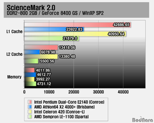 ScienceMark 2.0À¸·Î ÃøÁ¤ÇÑ ¸Þ¸ð¸® ´ë¿ªÆøÀº ¿ª½Ã ¸Þ¸ð¸® ÄÁÆ®·Ñ·¯¸¦ ³»ÀåÇÑ AMD CPUµéÀÌ 4000 ÈĹݴ븦 ±â·ÏÇϰí ÀÎÅÚ CPU´Â 4000 ¾ÈÆÆ¿¡ ¸Ó¹°·¶´Ù. ÇÏÁö¸¸ L1 ij½Ã ¹× L2 ij½Ã Å×½ºÆ® °á°ú´Â ÀÎÅÚ ÂÊÀÌ ÈξÀ ³ôÀº °á°ú¸¦ º¸¿©ÁÖ°í ÀÖ´Ù. Sandra Lita XII¿Í ´Þ¸® ScienceMark 2.0Àº CPU-Zó·³ ¸Þ¸ð¸® Ŭ·°ÀÌ ³ô°Ô ³ª¿Ô´ø ¼ÀÇÁ·Ð LE-1100ÀÌ ¾Ö½½·Ð64 X2 4000+º¸´Ù ´ë¿ªÆøÀÌ ³ô°Ô ÃøÁ¤µÇ¾ú´Ù.