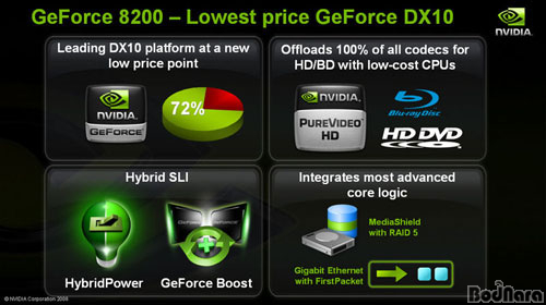 ÁöÆ÷½º 8200(GeForce 8200) ¸ÞÀκ¸µå´Â ¿£ºñµð¾Æ ³»Àå ±×·¡ÇÈ º¸µå Áß ´ÙÀÌ·ºÆ®X 10À» Áö¿øÇÏ´Â ÃÖÃÊÀÇ Á¦Ç°ÀÌ´Ù. ´ÙÀÌ·ºÆ®X ±×·¡ÇÈ Ä«µå ½ÃÀåÀÇ 72%¸¦ Á¡À¯Çϰí ÀÖ´Ù°í ¹àÈù ¿£ºñµð¾Æ´Â ³»Àå ±×·¡ÇÈ ºÐ¾ß¿¡¼­ AMD 690G¿¡ °íÀüÇß´ø ±â¾ïÀ» Áö¿ì±â À§ÇØ ÁöÆ÷½º 8200¿¡ ´ÙÀÌ·ºÆ®X 10°ú ÇÔ²² HD µ¿¿µ»ó Çϵå¿þ¾î °¡¼ÓÀ» À§ÇÑ PureVideo HD, ±×¸®°í ¿ÜºÎ ±×·¡ÇÈ Ä«µå¿Í ¿¬°èÇØ ¼Òºñ Àü·Â°ú ¼º´ÉÀ» °³¼±ÇÏ´Â ÇÏÀ̺긮µå SLI ±â¼úÀ» ³Ö¾ú´Ù.