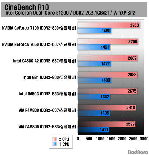 °¡Àå ºü¸¥ °á°ú¸¦ º¸¿©ÁØ °ÍÀº ¿ª½Ã µà¾ó ä³Î DDR2-800 ¸Þ¸ð¸®¸¦ Áö¿øÇÏ´Â ÀÎÅÚ G31 ¸ÞÀκ¸µå¿´À¸¸ç, µÎ ¹øÂ°¿Í ¼¼ ¹øÂ°µµ µà¾ó ä³Î ¸Þ¸ð¸®¸¦ Áö¿øÇÏ´Â ÀÎÅÚ 945GCÀÇ DDR2-667, DDR2-533 ½Ã½ºÅÛÀÌ Â÷ÁöÇß´Ù. ½Ì±Û ä³Î ¸Þ¸ð¸® ±¸¼º¿¡¼­´Â DDR2-800 > 667 > 533ÀÇ °á°ú·Î ³ª¿Ô´Âµ¥, °°Àº DDR2-667ÀÇ °á°ú¿¡¼­ FSB Ŭ·°ÀÌ ¹Ì¼¼ÇÏ°Ô ³ô¾Ò´ø ºñ¾Æ P4M900ÀÇ °á°ú°¡ ¿£ºñµð¾Æ ÁöÆ÷½º 7050À» ¾Õ¼¹´Ù.