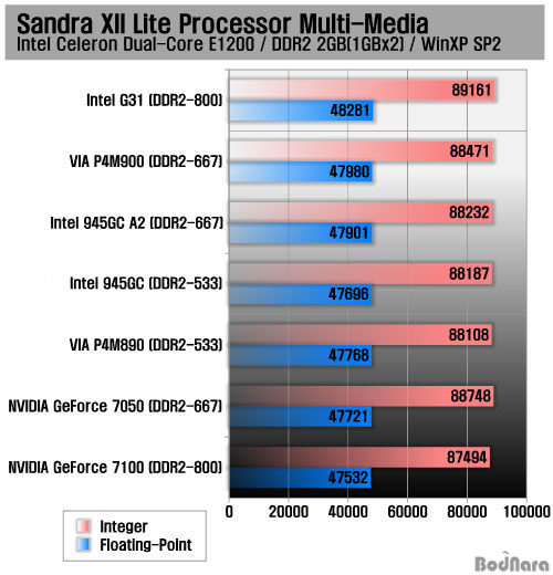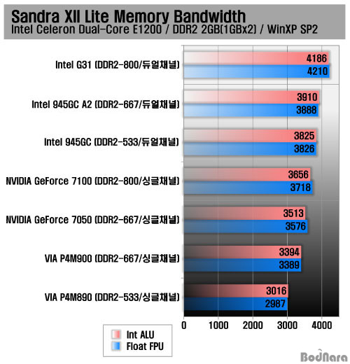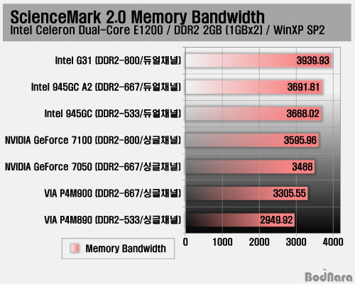 Sandra Lite XII·Î ÃøÁ¤ÇÑ ¸Þ¸ð¸® ´ë¿ªÆøÀº µà¾ó ä³Î ¸Þ¸ð¸® ±¸¼ºÀÌ °¡´ÉÇÑ ÀÎÅÚ G31°ú 945GC°¡ ¸Þ¸ð¸® Ŭ·°º°·Î 1~3µîÀ» Â÷ÁöÇßÀ¸¸ç, ½Ì±Û ä³Î ¸Þ¸ð¸® °¡¿îµ¥´Â DDR2-800À» Áö¿øÇÏ´Â ÁöÆ÷½º 7100ÀÌ °¡Àå ³ô¾Ò°í, DDR2-667 °á°úµµ ÁöÆ÷½º 7050ÀÌ ºñ¾Æ P4M900º¸´Ù ³ôÀº ´ë¿ªÆøÀ» ±â·ÏÇß´Ù. DDR2-533À¸·Î µ¿ÀÛÇÏ´Â ºñ¾Æ P4M890Àº µà¾ó ä³Î DDR2-800À¸·Î µ¿ÀÛÇÏ´Â ÀÎÅÚ G31ÀÇ 75% Á¤µµ¿¡ ºÒ°úÇß´Ù.