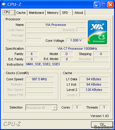 VIA C7 ÇÁ·Î¼¼¼­´Â CPU-Z¿¡¼­ ÀÚ¼¼ÇÑ Á¤º¸´Â ³ª¿ÀÁö ¾Ê´Âµ¥, µ¿ÀÛ Å¬·° 1GHz¿¡ L2 ij½ÃÀÇ ¿ë·®ÀÌ 128KB·Î Sempron LE-1100ÀÇ Àý¹ÝÀ̶ó´Â »ç½Ç Á¤µµ¸¸ È®ÀÎ °¡´ÉÇÏ´Ù. ÀúÀü·ÂÀ» Ç¥¹æÇÏ´Â Á¦Ç°´ä°Ô CPU Àü¾ÐÀÌ Athlon64 X2 3400+ EE¿Í ¸¶Âù°¡ÁöÀÎ 1V Á¤µµ. ¸Þ¸ð¸® Á¤º¸µµ ÀÚ¼¼È÷ ³ª¿ÀÁö ¾ÊÁö¸¸ ½Ì±Û ä³Î DDR2-533À¸·Î µ¿ÀÛÇϸç, ¸Þ¸ð¸® ŸÀ̹ÖÀº DDR2-667·Î µ¿ÀÛÇÏ´Â AMD ½Ã½ºÅÛº¸´Ù ºü¸£°Ô ¼³Á¤µÇ¾î ÀÖ´Ù.
