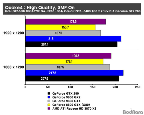 º¸¿©ÁÖ¾ú´Âµ¥ Quake4 ¿ª½Ã µà¾ó GPU ±¸¼ºÀÇ 9800 GX2°¡ ³ôÀº ¼º´ÉÀ» ³ªÅ¸³ÂÀ¸¸ç, GeForce GTX 280Àº