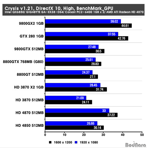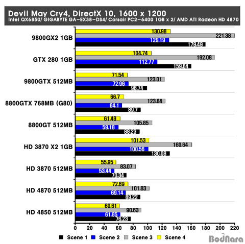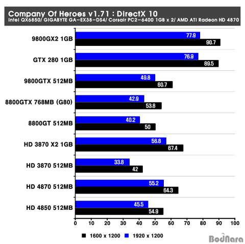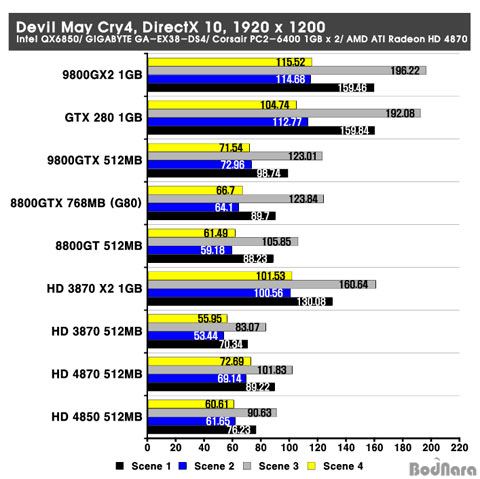 µîÀ» ¸ðµÎ ³Ñ¾î¼°í ÀÖ´Ù. DirectX 10 ȯ°æ¿¡¼´Â HD 4850°ú GeForce 9800GTX¸¦ ¸ðµÎ ¾Õ¼°í ÀÖ°í