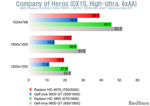 Compnay of Heros °ÔÀÓ¿¡¼­ 4xAA ¼³Á¤À¸·Î Å×½ºÆ®ÇÑ °á°ú ¶óµ¥¿Â HD 4670Àº ÁöÆ÷½º 9500 GTº¸´Ù´Â ¿ùµîÈ÷ ³ôÀº ¼º´ÉÀ» º¸¿´°í, ¶óµ¥¿Â HD 3850À̳ª ÁöÆ÷½º 9600 GT ÂÊ¿¡ °¡±î¿î °á°ú¸¦ ³ªÅ¸³Â´Ù.