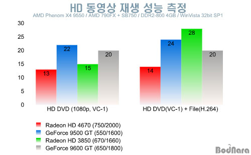 ÁöÆ÷½º 9500 GT, 9600GT´Â VC-1 Æ÷¸Ë¿¡¼­ AMD ¶óµ¥¿Â °è¿­º¸´Ù CPU »ç¿ë·üÀÌ ³ô±â ¶§¹®¿¡ HD DVD ŸÀÌÆ²¸¸ Àç»ýÇÒ °æ¿ì¿¡µµ 20%´ëÀÇ CPU »ç¿ë·üÀÌ ³ª¿ÔÁö¸¸, µà¾ó ½ºÆ®¸² °¡¼Ó ±â´ÉÀ» ³»ÀåÇϰí ÀÖ¾î HD DVD¿Í µ¿½Ã¿¡ HD µ¿¿µ»ó ÆÄÀÏÀ» Àç»ýÇÏ´õ¶óµµ CPU »ç¿ë·üÀÌ ¿Ã¶ó°¡Áö ¾Ê¾Ò´Ù. ±×·¯³ª ¶óµ¥¿Â HD 3850Àº µà¾ó ½ºÆ®¸² µðÄÚµù ±â´ÉÀÌ ¾ø¾î 2°³ÀÇ µ¿¿µ»óÀ» µ¿½Ã¿¡ µ¹·ÈÀ» ¶§ CPU »ç¿ë·üÀÌ Å©°Ô Áõ°¡Çß´Ù.