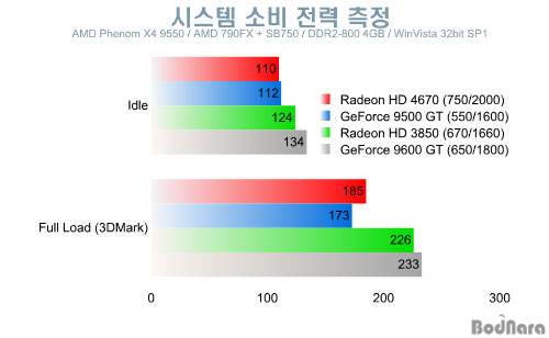 ¶óµ¥¿Â HD 4670Àº ´Ã¾î³­ Æ®·£Áö½ºÅÍ ¼ýÀÚ¿Í ³ô¾ÆÁø µ¿ÀÛ Å¬·°¿¡µµ ºÒ±¸Çϰí TDP´Â ±âÁ¸ ¶óµ¥¿Â HD 3650ÀÇ 79Wº¸´Ù ÈξÀ ³·Àº 59W·Î µÇ¾î Àִµ¥, Å×½ºÆ® °á°ú 50W¸¦ »ç¿ëÇÏ´Â ÀÚÆ÷½º 9500 GT¿Í ºñ±³ÇØ Idle »óÅ¿¡¼­´Â 2W °¡·® ³·¾Ò°í Ç®·Îµå·Î »ç¿ëÇÒ ¶§´Â 12W °¡·® ´õ ³ô°Ô ³ªÅ¸³µ´Ù.