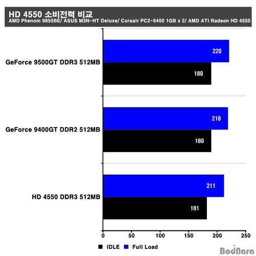 Å×½ºÆ® °á°ú HD 4550Àº 20W TDP¸¦ °¡Áö±â ¶§¹®¿¡ GeForce 9400GT/ 9500GTÀÇ 50W TDPº¸´Ù ¼öÄ¡°¡ ³·°í ½ÇÁ¦ Àüü ½Ã½ºÅÛÀÇ ¼ÒºñÀü·Â ¿ª½Ã IDLE¿¡¼´Â 8W, Full Load¿¡¼´Â 7-9W ¼öÁØÀÇ Â÷À̸¦ º¸¿©ÁÖ°í ÀÖ´Ù. ÇÏÁö¸¸, ¼öÄ¡ »óÀ¸·Î ³ªÅ¸³ª´Â °Íº¸´Ù´Â Å« Â÷À̸¦ º¸ÀÌÁö´Â ¾Ê¾Ò´Ù°í º¼ ¼ö ÀÖ´Ù. GeForce 9400GT/ 9500GT´Â °°Àº 50W TDP Áö¸¸, GeForce 9400GT°¡ Full Load¿¡¼ 2W Á¤µµ ´õ ³·Àº ¼ÒºñÀü·ÂÀ» °¡Áö´Â °ÍÀ¸·Î ³ªÅ¸³µ´Ù.