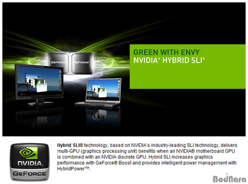NVIDIA Hybrid SLI ±â¼ú Áß ¿ÜÀåÇü Ä«µå¿Í ³»Àå ±×·¡ÇÈ Á¶ÇÕÀ¸·Î ¼º´ÉÀ» ³ôÀÏ ¼ö ÀÖ´Â GeForce Boost´Â Àú°¡Çü ¿ÜÀå ±×·¡ÇÈ Ä«µå¿ÍÀÇ Á¶ÇÕÀÌ ÇÊ¿äÇÏ°í ¹Ý´ë·Î °í¼º´É ±×·¡ÇÈ Ä«µåµé°ú´Â ¼ÒºñÀü·ÂÀ» ÁÙÀÏ ¼ö ÀÖ´Â HybridPower¸¦ Áö¿øÇÑ´Ù.
