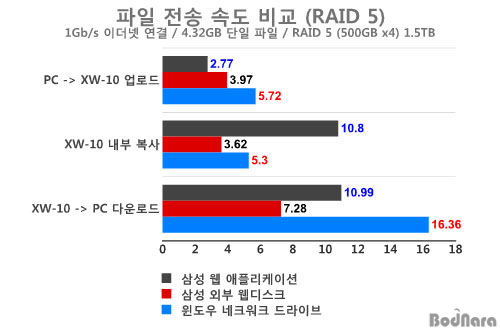¿ì¼± È®Àå º¼·ý(JBOD) ±¸¼ºÀ¸·Î ´Ü¼øÈ÷ 4°³ÀÇ Çϵ带 ÇϳªÀÇ °¡»ó ´ÜÀÏ µå¶óÀ̺ê·Î ¼³Á¤ÇÑ »óÅ¿¡¼ÀÇ ÆÄÀÏ Àü¼Û ¼Óµµ¸¦ ºñ±³ÇÑ °á°ú ¾÷·Îµå¿Í ´Ù¿î·Îµå¿¡¼´Â ³×Æ®¿öÅ© µå¶óÀÌºê ¼³Á¤ÀÌ °¢°¢ 10.56MB/s¿Í 21.38MB/s·Î °¡Àå ºü¸¥ ¼Óµµ¸¦ ±â·ÏÇßÀ¸¸ç, XW-10 ³»ºÎ¿¡¼ÀÇ ÆÄÀÏ º¹»ç´Â À¥Çϵå(À¥ ¾ÖÇø®ÄÉÀ̼Ç) ¹æ½ÄÀÌ ¾÷/´Ù¿î·Îµå¸¦ ÇÒ ¶§º¸´Ùµµ ´õ ºü¸¥ °ÍÀ¸·Î ³ªÅ¸³µ´Ù.
