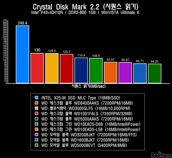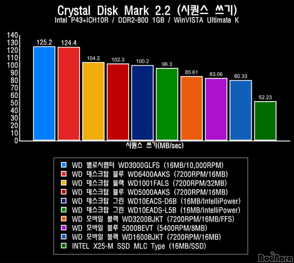 Àбâ¼Óµµ´Â º§·Î½Ã·¦ÅÍ¿¡ ºñÇØ ¿ÀÈ÷·Á ºí·ç 640GB°¡ 130MB/sec·Î ³ôÀº ¼Óµµ·Î µµÃâÇÑ Crystal Disk Mark 2.2´Â ¾²±â¼Óµµ´Â MLC¸¦ »ç¿ëÇÑ ÀÎÅÚ SSD°¡ °¡Àå ´À¸° °ÍÀ¸·Î ³ªÅ¸³­´Ù. Àб⿡¼­´Â 129.5MB/sec·Î 3À§, ¾²±â¼Óµµ¿¡¼­´Â 125.2MB/sec¸¦ ±â·ÏÇÑ º§·Î½Ã·¦ÅͰ¡ Àü¹ÝÀûÀÎ ¼º´É¿¡¼­´Â °¡Àå ¾Õ¼± °ÍÀ¸·Î Æò°¡ÇÒ ¼ö ÀÖ´Ù.