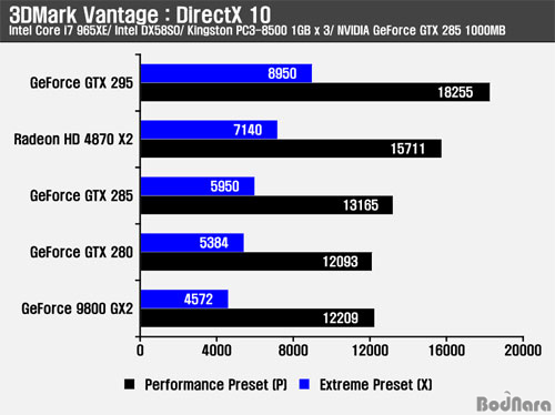 È®ÀÎÇÒ ¼ö ÀÖ´Â 3DMark Vantage¿¡¼ 55nm GeForce GTX 285 (ÀÌÇÏ, GTX 285)´Â ½Ì±Û GPU·Î °¡Àå ³ôÀº ¼º´ÉÀ» Á¦°øÇϰí ÀÖ´ø 65nm GeForce GTX 280 (ÀÌÇÏ, GTX 280)À» ¾Õ¼± ¼º´ÉÀ» Á¦°øÇÏ¿´À¸¸ç, Ç÷¡±×½± µà¾ó GPUµé°ú´Â Â÷À̸¦ ³ªÅ¸³»Áá°í ÀÌÀü G92 ±â¹Ý GeForce 9800 GX2 (ÀÌÇÏ, 9800 GX2) µà¾ó GPU¸¦ ¾Õ¼´Â ¼º´ÉÀ» Á¦°øÇÑ´Ù. GTX 285´Â 55nm °øÁ¤ Àû¿ë°ú ÄÚ¾î/ ¸Þ¸ð¸®/ ½¦ÀÌ´õ Ŭ·°ÀÇ Áõ°¡·Î GTX 280 ´ëºñ ÆÛÆ÷¸Õ½º ÇÁ¸®¼Â¿¡¼´Â ¾à 8.9%, ÀͽºÆ®¸² ÆÛÆ÷¸Õ½º¿¡¼´Â ¾à 10.5%ÀÇ ¼º´ÉÀÌ Çâ»óµÇ¾ú´Ù.