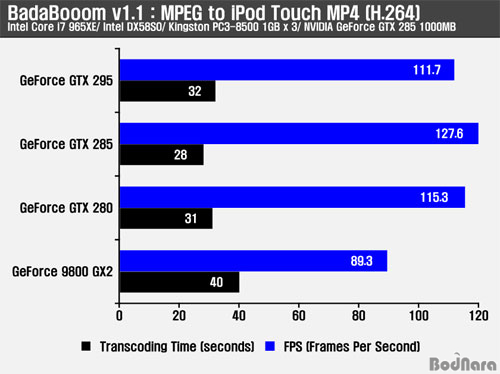 ¹Ù´ÙºÕ 1.1¹öÀüÀº GTX 295 Å×½ºÆ®¿¡ ¾ð±ÞÇÏ¿´µíÀÌ DivX µîÀÇ ÄÚµ¦°ú ÆÄÀÏ Æ÷¸Ë Áö¿ø Ãß°¡, ±×¸®°í À¯Åõºê, ºí·¢ º£¸® º¼µå µîÀÇ ÇÁ¸®¼Â, 1080 Áö¿ø µîÀÌ Ãß°¡µÇ¾ú´Ù. Æ®·£½ºÄÚµùÀº Å͹̳×ÀÌÅÍ2 : ½ÉÆÇÀÇ ³¯ 1080p MPEG ¿µ»óÀ» iPod Touch MP4 (H.264)·Î ÀçÀÎÄÚµùÇÏ´Â ½Ã°£À» ºñ±³Çß´Ù. ¹Ù´ÙºÕ 1.1 ¹öÀüÀº SLI ¸ÖƼ GPU ±¸¼ºÀ» Áö¿øÇÏÁö ¾Ê¾Æ ½Ì±Û GPU·Î¸¸ º¸¾ÒÀ» ¶§ °¡Àå ³ôÀº ¼º´ÉÀ» Á¦°øÇÏ´Â GTX 285°¡ °¡Àå ºü¸£°Ô ÀçÀÎÄÚµùÀ» ¸¶ÃÆÀ¸¸ç, ó¸® FPSµµ °¡Àå ¿ì¼öÇß´Ù.