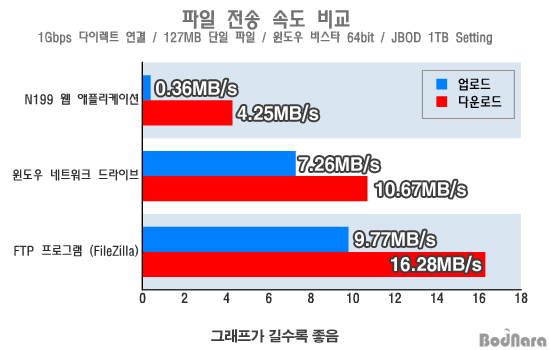 Å×½ºÆ® °á°ú N199¿¡¼ Áö¿øÇÏ´Â À¥ µð½ºÅ©¸¦ ÅëÇØ ÆÄÀÏÀ» ¾÷·Îµå ÇÒ °æ¿ì 127MB¸¦ Àü¼ÛÇϴµ¥ ÃÑ 5ºÐ 50ÃÊ °¡·®ÀÌ °É·ÈÀ¸¸ç, ´Ù¿î·Îµå ¹Þ´Âµ¥´Â ¾à 30ÃÊ Á¤µµÀÇ ½Ã°£ÀÌ ¼Ò¿äµÇ¾ú´Ù. ¹Ý¸é, À©µµ¿ì¿¡¼ ³×Æ®¿öÅ© µå¶óÀ̺ê·Î ¼³Á¤ÇßÀ» ¶§³ª FTP ÇÁ·Î±×·¥À» ÅëÇÑ FTP Á¢¼Ó½Ã ÆÄÀÏ ¾÷/´Ù¿î·Îµå ¼Óµµ´Â À¥ µð½ºÅ©º¸´Ù ÈξÀ »¡¶ú´Ù.