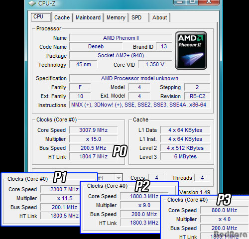 65nm Æä³Ñ X4 9950BE°¡ P1 State¿¡¼ 1300 (200 x 6.5)MHz, P0¿¡¼ 2600 (200 x 13)MHz·Î 2´Ü°èÀÎ ¹Ý¸é, 45nm Æä³Ñ2 X4 940BE¸¦ ¿¹·Î µé¸é 800 (P3 State 200 x 4, P2 State 200 x 9, P1 State°¡ 200 x 11.5, P0°¡ 200 x 15·Î ±âº» Ŭ·° Àû¿ë)MHz°¡ ÃÖÀú Ŭ·°ÀÌ´Ù.