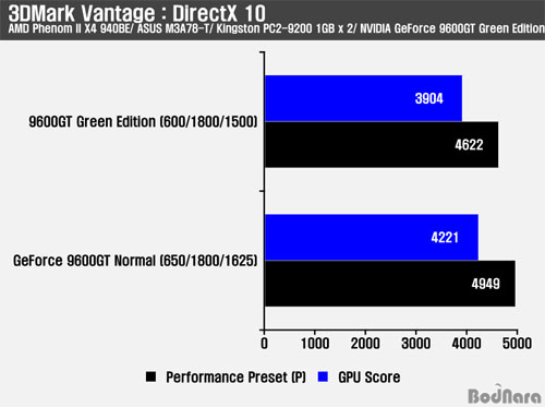3DMark Vantage¿Í °ÔÀӵ鿡 AA/ AF¸¦ Àû¿ëÇÏÁö ¾Ê¾ÒÀ» °æ¿ì GeForce 9600GT ±×¸°¿¡µð¼ÇÀº ÀÏ¹Ý ¹öÀü°ú ºñ±³ÇÏ¿© ÄÚ¾î¿Í ½¦ÀÌ´õ Ŭ·°ÀÌ ³·¾ÆÁø ¸¸Å­ ¼º´ÉÀÌ ³·¾ÆÁ³À¸¸ç, ¾à 5-8% ³»¿ÜÀÇ ¼º´É Â÷À̸¦ º¸¿©ÁÖ°í ÀÖ´Ù. AA/ AF¸¦ Àû¿ëÇÒ °æ¿ì¿¡´Â À̺¸´Ù ´õ ³ôÀº Â÷À̸¦ º¸ÀÏ ¼ö ÀÖÀ» °ÍÀ¸·Î ¿¹»óµÈ´Ù.