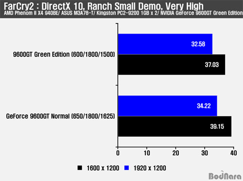 FarCry2´Â DirectX 10ȯ°æ°ú Very High·Î ±×·¡ÇÈ ¿É¼ÇÀ» ¼±ÅÃÇÑ ÈÄ ¼º´ÉÀ» ºñ±³Çß´Ù. Å×½ºÆ® °á°ú GeForce 9600GT ±×¸°¿¡µð¼ÇÀº ¾Õ¼­ÀÇ 3DMark Vantag¿Í ¸¶Âù°¡Áö·Î ÇÁ·¹ÀÓÀÇ Â÷À̰¡ ³ªÅ¸³µ´Ù. GeForce 9600GT ±×¸°¿¡µð¼ÇÀº ÀÏ¹Ý ¹öÀü (100% ¼º´É)À» ±âÁØÀ¸·Î 1600 x 1200 ÇØ»óµµ¿¡¼­´Â ¾à -5.42% (ÀÏ¹Ý ¹öÀü ±âÁØ 94.58%ÀÇ ¼º´É), 1920 x 1200 ÇØ»óµµ¿¡¼­´Â ¾à -4.79% (ÀÏ¹Ý ¹öÀü ±âÁØ 95.21%ÀÇ ¼º´É)ÀÇ ¼º´É ÀúÇϰ¡ ³ªÅ¸³µ´Ù.
