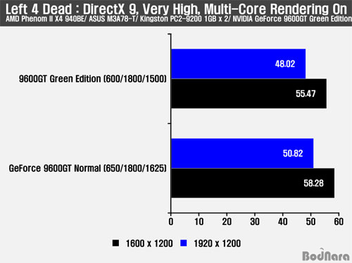 Left 4 Dead´Â ¹ëºêÀÇ °³¼±µÈ ¼Ò½º ¿£Áø°ú ÅÍÆ²¶ô ½ºÆ©µð¿ÀÀÇ ÀΰøÁö´É ¹öÀü2¸¦ ±â¹ÝÀ¸·Î ¸¸µé¾îÁø °ÔÀÓÀ̸ç, ÇÏÇÁ¶óÀÌÇÁ ¿£Áø ±â¹ÝÀÇ °ÔÀÓµéÀÌ Radeon ±×·¡ÇÈ Ä«µåµé¿¡¼­ °­¼¼¸¦ º¸¿©ÁÖ°í ÀÖ´Ù. Å×½ºÆ® °á°ú ¾Õ¼­ÀÇ °á°úµéó·³ GeForce 9600GT ±×¸°¿¡µð¼ÇÀº ÄÚ¾î¿Í ½¦ÀÌ´õ Ŭ·°ÀÌ ³·¾ÆÁ® Á¶±Ý ´õ ³·Àº ÇÁ·¹ÀÓÀ» º¸¿©ÁØ´Ù. GeForce 9600GT ±×¸°¿¡µð¼ÇÀº ÀÏ¹Ý ¹öÀüÀ» ±âÁØÀ¸·Î 1600 x 1200 ÇØ»óµµ¿¡¼­´Â ¾à -4.82% (ÀÏ¹Ý ¹öÀü ±âÁØ 95.18%ÀÇ ¼º´É), 1920 x 1200 ÇØ»óµµ¿¡¼­´Â ¾à -5.51% (ÀÏ¹Ý ¹öÀü ±âÁØ 94.49%ÀÇ ¼º´É)ÀÇ ¼º´É ÀúÇϰ¡ ³ªÅ¸³µ´Ù.