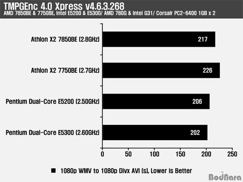¶Ç, Å×½ºÆ®¿¡ ¸¹ÀÌ »ç¿ëÇÏ´Â ÀÎÄÚµù ÇÁ·Î±×·¥ÀÎ TMPGEnc 4.0 Xpress´Â DivX ÄÚµ¦À» ÀÌ¿ëÇÏ¿© 1080p WMV HD ÆÄÀÏ (Å͹̳×ÀÌÅÍ2 : ½ÉÆÇÀÇ ³¯)À» 1920 x 1080p DivX AVI·Î ÀçÀÎÄÚµùÇÏ´Â ½Ã°£À» ºñ±³Çß´Ù. Å×½ºÆ® °á°ú ´ÙÀ½ ÆÌÀÎÄÚ´õ¿Í °°ÀÌ À̹ø¿¡µµ ÀÎÅÚ °è¿­ CPUµéÀÌ Á¶±Ý ´õ ºü¸¥ ½Ã°£ ³»¿¡ ÀçÀÎÄÚµù ÀÛ¾÷À» ³¡¸¶ÃÆ´Ù.