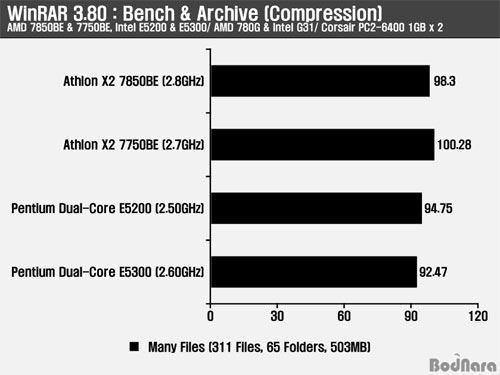 ¾ÐÃà ¼º´É Å×½ºÆ®´Â WinRAR 3.80À» ÀÌ¿ëÇßÀ¸¸ç, ´Ù¼öÀÇ ÆÄÀϰú Æú´õ¸¦ Æ÷ÇÔÇÑ »ùÇà ÆÄÀϵéÀ» ÅëÇØ ¾ÐÃà½Ã°£À» ºñ±³Çß´Ù. WinRARÀº ¸ÖƼ ½º·¹µå¸¦ Áö¿øÇϰí ÀÖ¾î µà¾óÄÚ¾î ÀÌ»óÀÇ CPU¸¦ »ç¿ëÇÒ °æ¿ì ¾ÐÃà ½Ã°£À» ´ÜÃà½Ãų ¼ö ÀÖ´Ù.